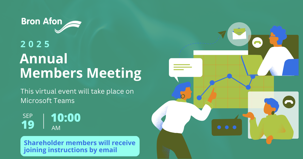 We’re pleased to invite our members to the Bron Afon Annual Members’ Meeting (AMM) which will be held virtually, via MS Teams, on Friday 19th September 2025 at 10:00am.