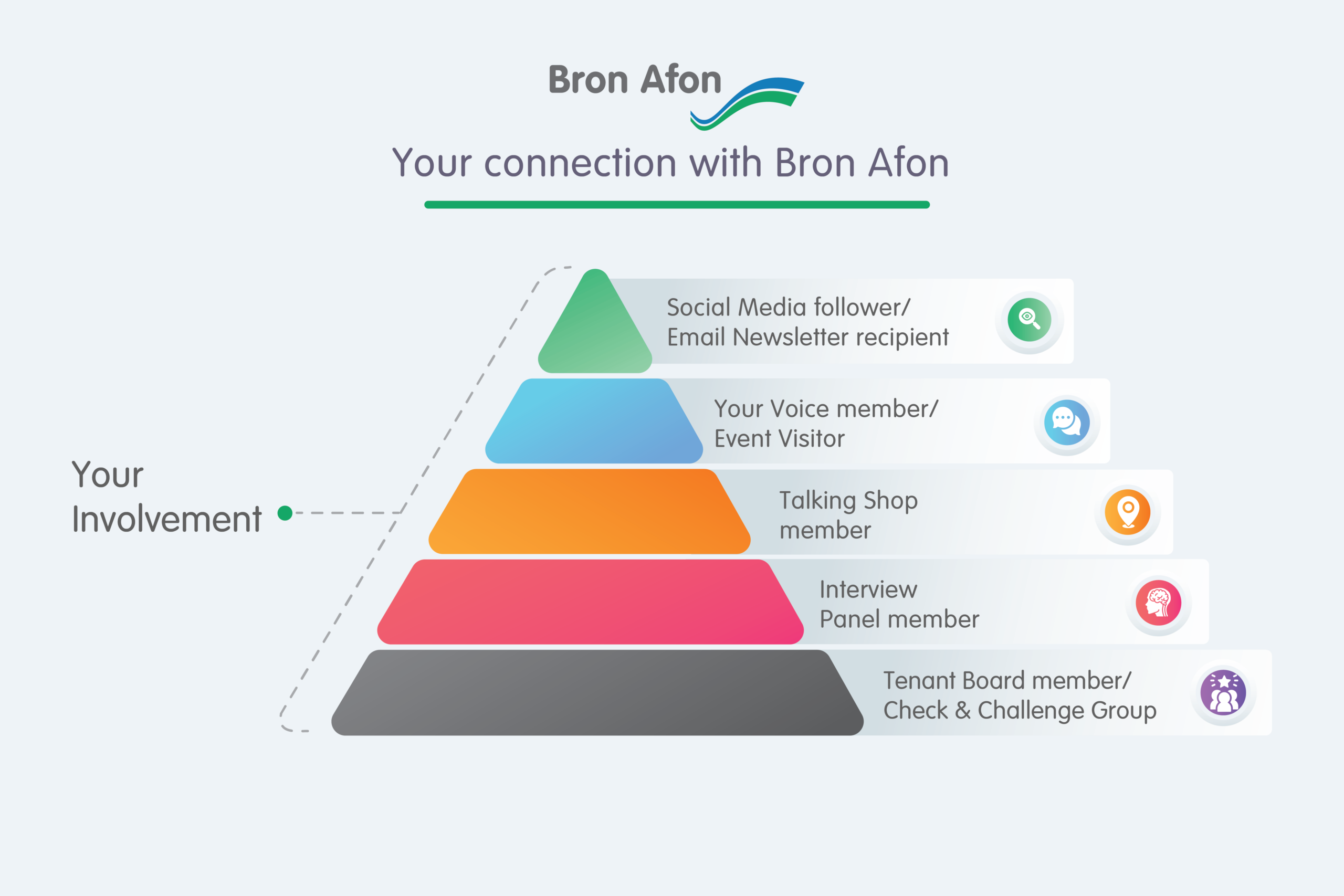 • Become a Board member and help play a role in shaping governance and guiding our operations to make sure Bron Afon acts in the best interests of our customers, colleagues and communities. We will advertise and recruit when there is a vacancy.
